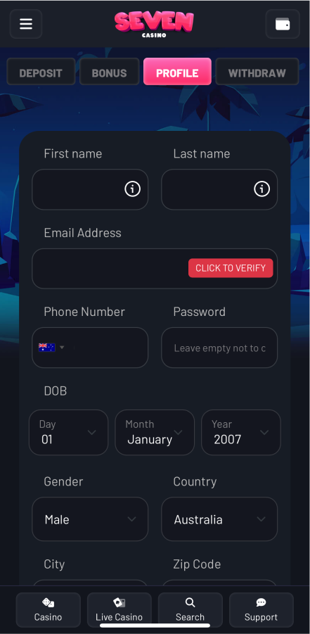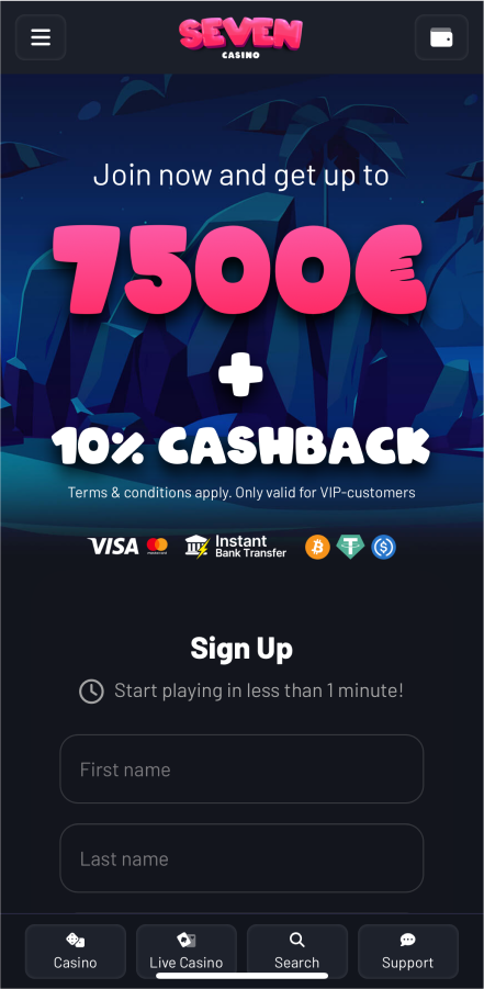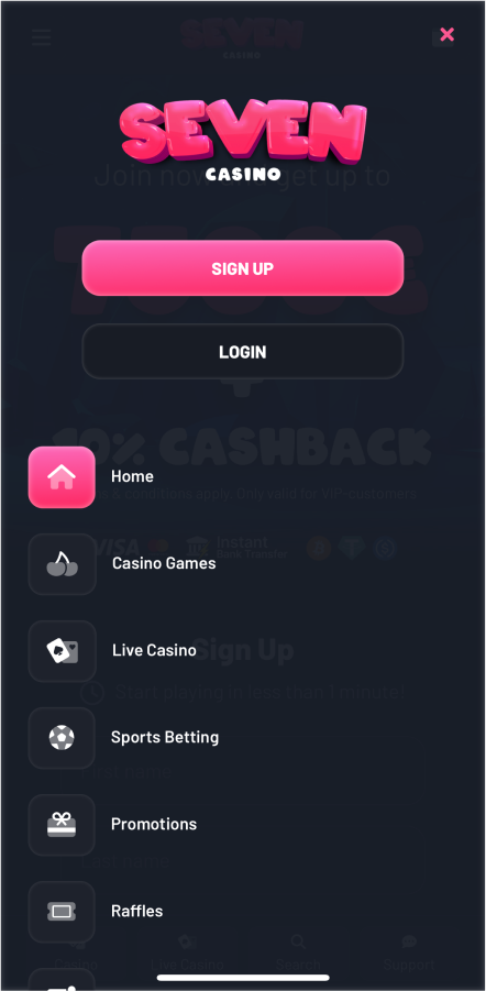 If you decide to start using the Seven Casino services in the mobile app, you will be able to sign up directly after downloading and installing the app. The procedure requires users to take the same steps as on the original website and lasts for no more than 3-4 minutes: