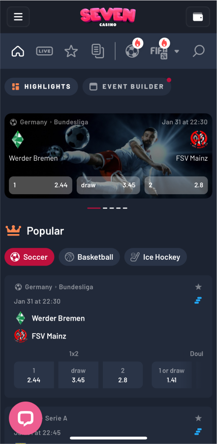 Apart from gambling online, mobile users are provided with an opportunity to make stakes on sporting events in the Seven Casino app. The sportsbook encompasses all popular sporting disciplines and allows players to make long-term, short-term, pre-match, in-play, single, and system bets. Usually, more than a thousand competitions are accessible for your stakes in the app. The following types of sports and esports can be selected: