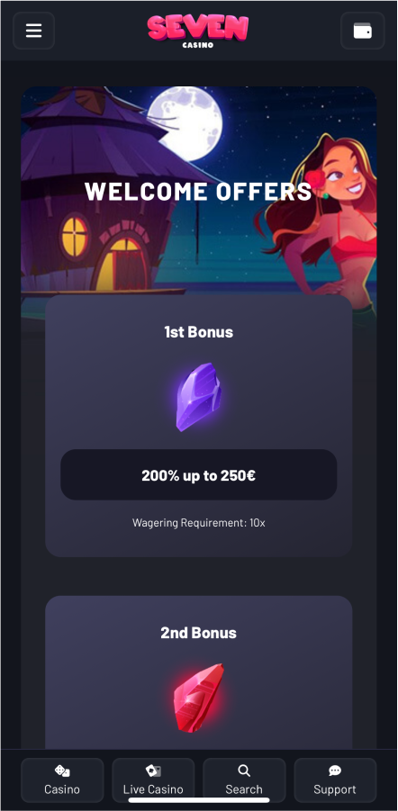 Right now, the brand does not bestow any bonuses for the Seven Casino app installation. However, new players are eligible for one of 3 Signup bonuses immediately after the signing-up procedure is completed. These promotions are: